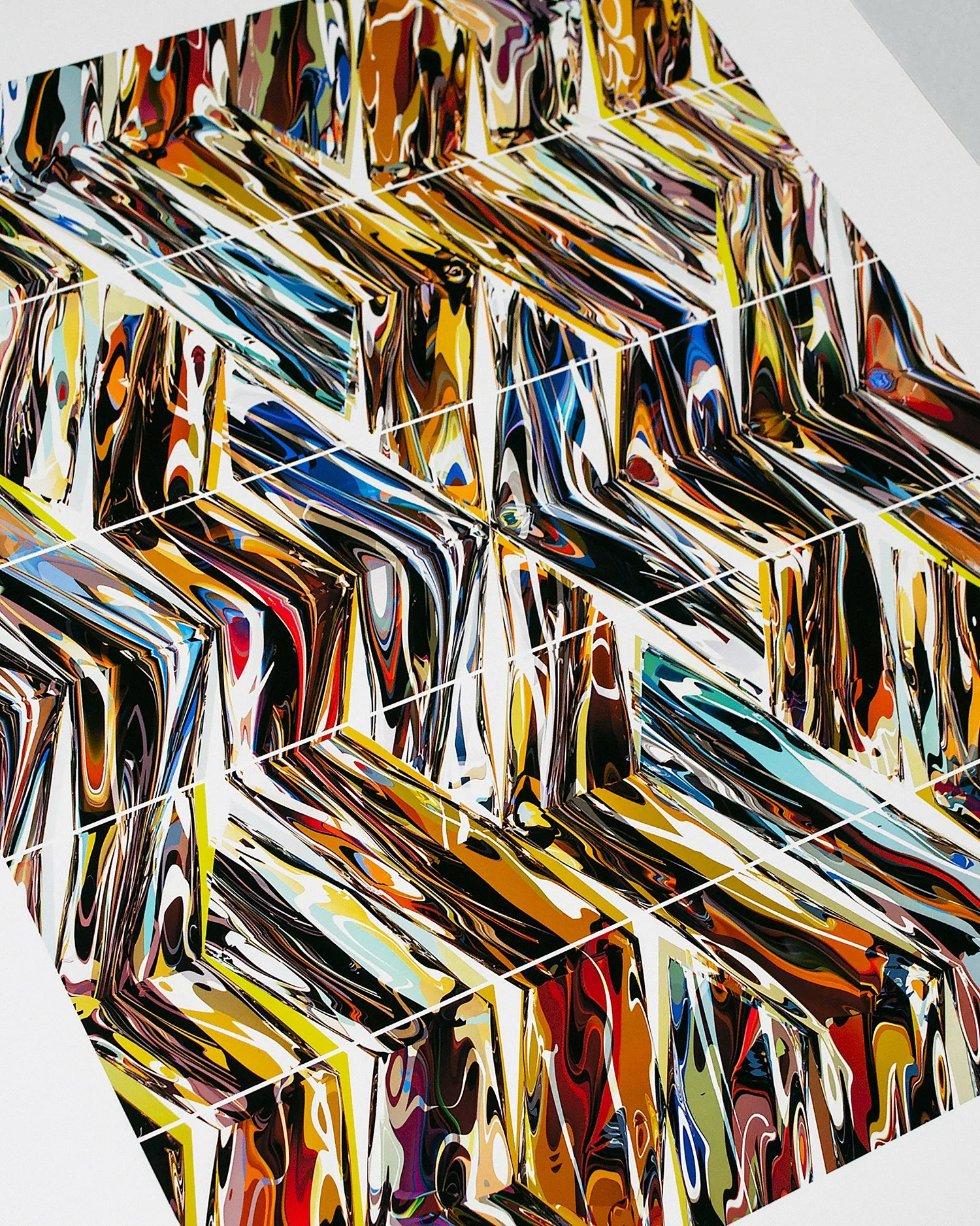 …The cut lines don’t line up where the geometry actually breaks itself; and it’s got this kind of glitch going on which I really like. That’s to do with the way the geometry is layered into space, it’s the kind of inflection point as it changes direction, and has a certain kind of perspective which moves them in the space, it means they’re not all lined up; there’s an arcing (quality) to them which is rather beautiful. It adds in a whole load of interesting details to where the colours switch direction and creates these little kind of glitched pieces of panels of colour, and details or flecks on the final picture.